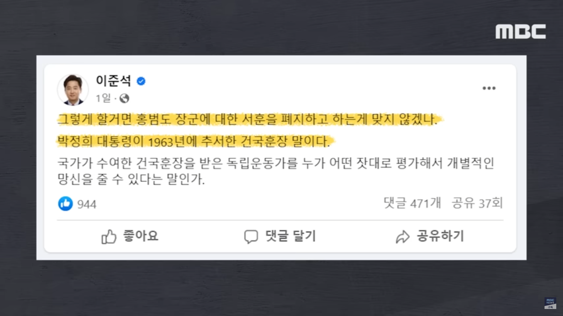 그렇게 할 거면 박정희 대통령이 혼범도 장군에 대해 1963년 초소한 건국 훈장부터